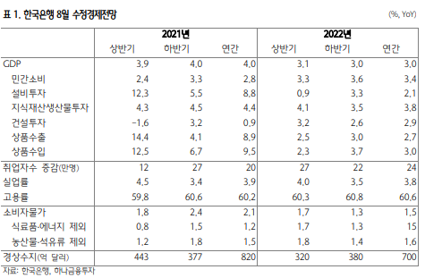 - 국내경제는 양호한 회복세를 이어갔음. 코로나19 재확산 영향으로 민간소비가 다소 둔화되었으나 수출이 호조를 지속하고 설비투자도 견조한 흐름을 나타내었다. 고용 상황은 취업자수 증가가 지속되는 등 개선세를 이어갔다. 앞으로 국내경제는 수출과 투자가 호조를 지속하는 가운데 민간소비가 백신접종 확대, 추경 진행 등으로 점차 개선되면서 회복세를 이어갈 것으로 보인다. 금년중 GDP성장률은 지난 5월에 전망한 대로 4% 수준을 나타낼 것으로 예상됨
