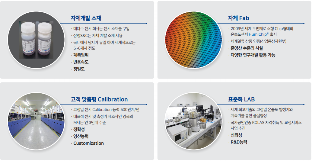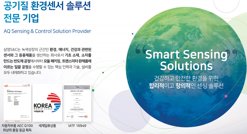 저희 삼영S&C는 그린뉴딜의 근간인 환경, 에너지, 건강과 관련된 센서와 그 응용제품을 생산 하는 회사로서 소재 합성, MEMS 반도체 소자 제조, 모듈 패키징, 트랜스미터 완제품에 이르는 일괄 공정을 수행 할 수 있는 핵심 인력과 기술, 설비까지 모두 내재화 하고 있습니다. 스마트 온·습도 센서의 Global Leader로서 세계적인 자동차회사와 산업용기기 업체에 순수 국산 스마트센서를 수출, 지난 10년간 연평균 20% 이상 성장해오고 있으며, 연매출 12% 이상의 꾸준한 연구개발 투자로 핵심 원천기술 확보와 미래 성장 동력을 구축하여 왔습니다. 지구환경변화, COVID-19, 친환경 자동차, 자율주행, 4차 산업혁명 등 초변화 시대에서 저희가 그동안 쌓아온 고정밀, 고신뢰, 고부가 온습도, 미세먼지, 가스 등의 융복합 환경센서 분야 핵심 원천 기술은 미래 고성장의 중요한 기반이 될 것입니다. 이번 코스닥시장 상장을 통해, 저희 삼영S&C는 Smart Sensing Solution을 넘어 AI 기반 지능형 Intelligent Sensing Solution 공급업체로서 환경센서 분야의 세계적인 강소기업 으로 도약 할 것을 약속 드립니다.